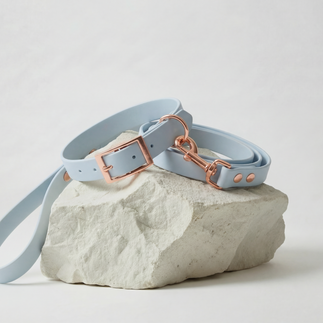 Elevate your pet's gear with our matching set, including a waterproof Biothane personalized collar and a matching leash. Add your pet's name to either item for a personal touch, and enjoy the ease of getting everything you need in one package.