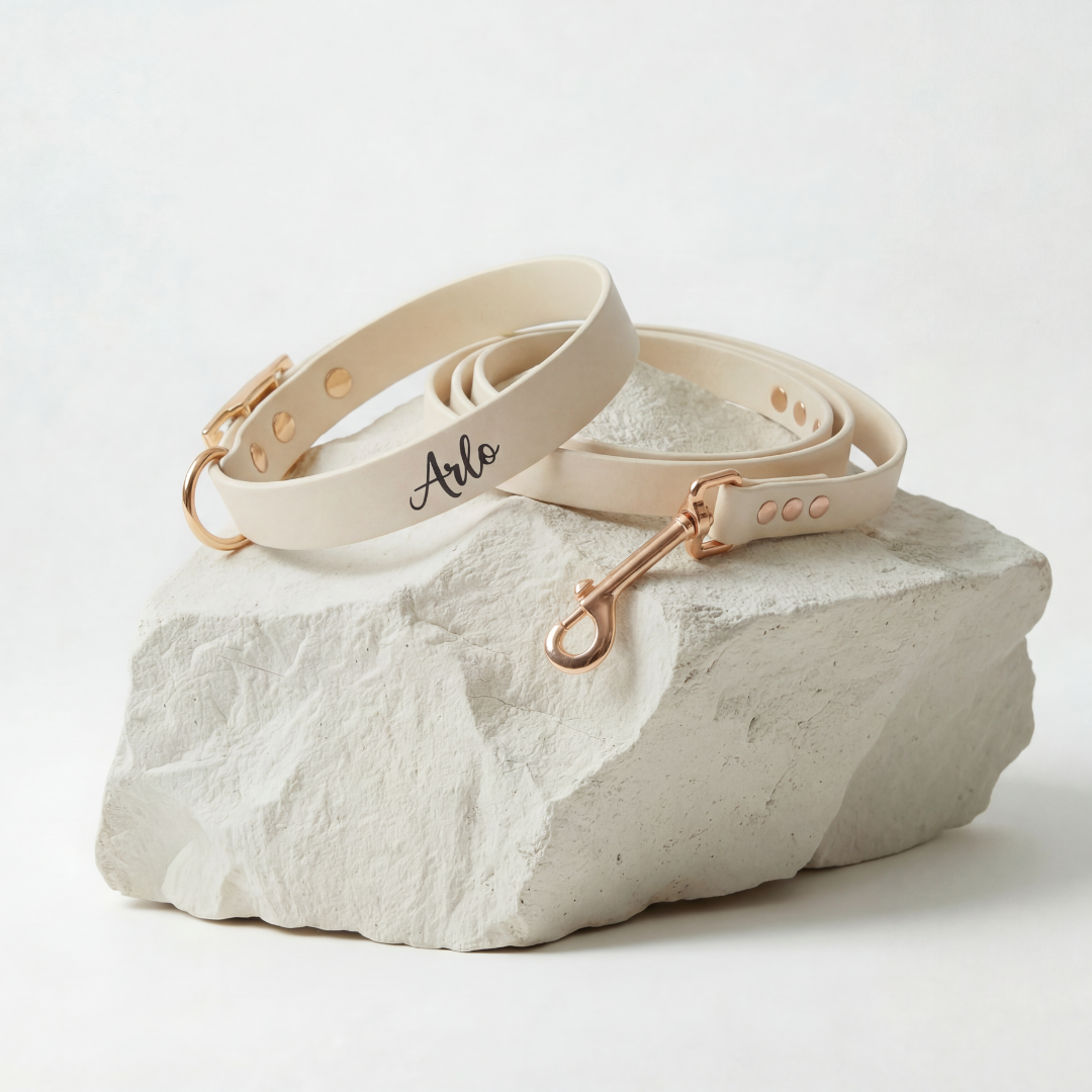 Elevate your pet's gear with our matching set, including a waterproof Biothane personalized collar and a matching leash. Add your pet's name to either item for a personal touch, and enjoy the ease of getting everything you need in one package.