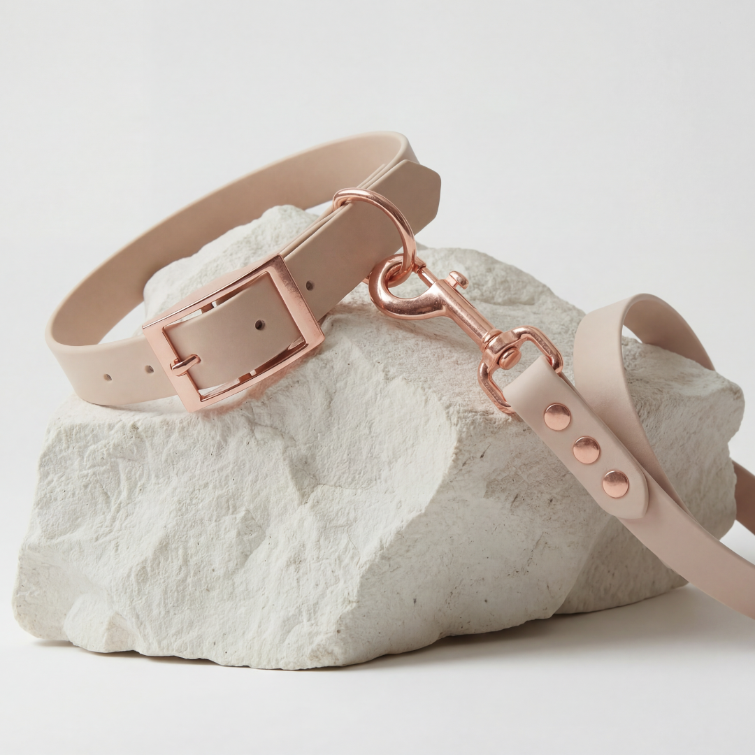 Elevate your pet's gear with our matching set, including a waterproof Biothane personalized collar and a matching leash. Add your pet's name to either item for a personal touch, and enjoy the ease of getting everything you need in one package.